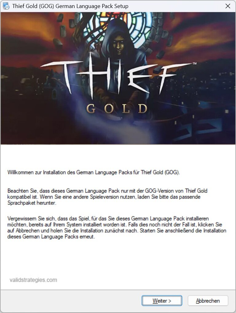 Dieses German Language Pack wandelt die fremdsprachige GOG-Version von Thief Gold in die deutsche Fassung um. Ladet euch einfach die Datei herunter, entpackt Sie in ein beliebiges Verzeichnis auf eurem PC und führt das Sprachpaket aus. Ihr werdet dann Schritt für Schritt durch die Installation geführt. Anschließend liegt das Spiel auf eurem System in der deutschen Fassung vor.