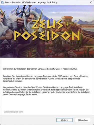 Dieses German Language Pack wandelt die fremdsprachige GOG-Version von Zeus + Poseidon in die deutsche Fassung um. Ladet euch einfach die Datei herunter, entpackt Sie in ein beliebiges Verzeichnis auf eurem PC und führt das Sprachpaket aus. Ihr werdet dann Schritt für Schritt durch die Installation geführt. Anschließend liegt das Spiel auf eurem System in der deutschen Fassung vor.