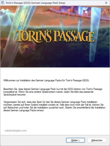 Dieses German Language Pack wandelt die fremdsprachige GOG-Version von Torin's Passage in die deutsche Fassung um. Ladet euch einfach die Datei herunter, entpackt Sie in ein beliebiges Verzeichnis auf eurem PC und führt das Sprachpaket aus. Ihr werdet dann Schritt für Schritt durch die Installation geführt. Anschließend liegt das Spiel auf eurem System in der deutschen Fassung vor.