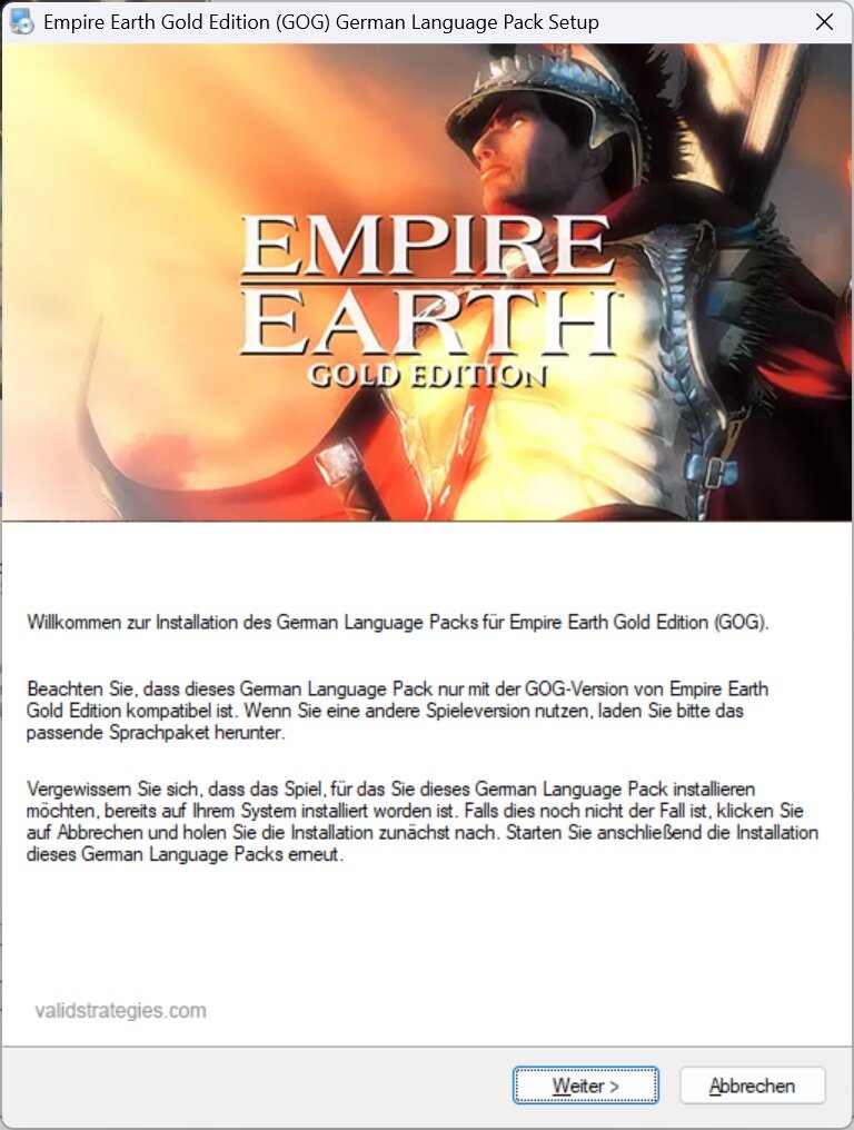 Dieses German Language Pack wandelt die fremdsprachige GOG-Version von Empire Earth Gold Edition in die deutsche Fassung um. Ladet euch einfach die Datei herunter, entpackt Sie in ein beliebiges Verzeichnis auf eurem PC und führt das Sprachpaket aus. Ihr werdet dann Schritt für Schritt durch die Installation geführt. Anschließend liegt das Spiel auf eurem System in der deutschen Fassung vor.